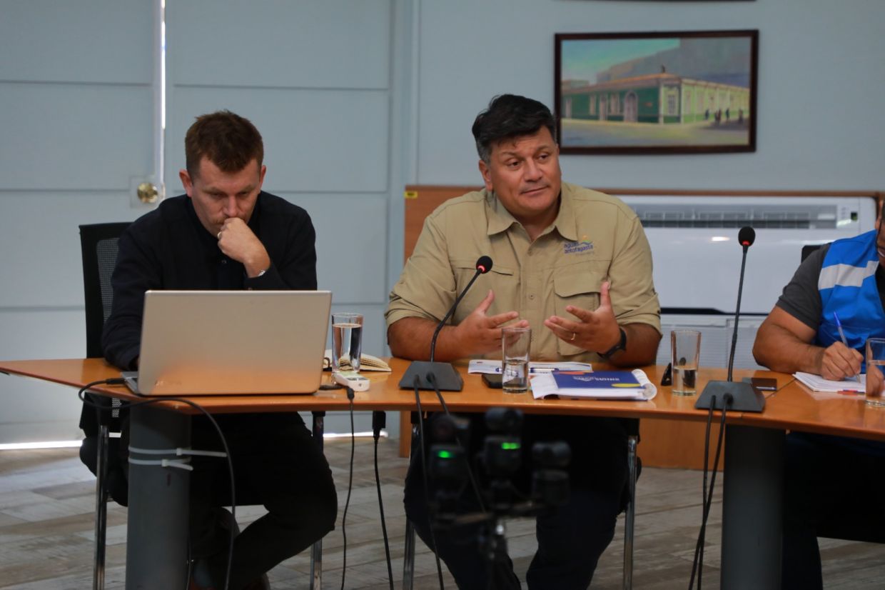 El edil(s) explicó que se convocó a esta instancia, dado que el objetivo es buscar una rápida solución ante una situación que reviste un riesgo en una cañería, a fin de no poner en peligro el suministro del vital líquido y también servicios de telecomunicaciones y energía. Castro destacó que se analizaron diversos escenarios, y lo fundamental es que no habrá afectación en el suministro de agua potable para la población, de acuerdo a lo informado por la compañía. El gerente de Operaciones de Aguas Antofagasta, Cristián Jiménez, valoró la articulación desde el municipio con empresas de servicios y privados, dado que esto reviste gran importancia no sólo para éstas sino que para toda la comunidad. | El ejecutivo de la sanitaria explicó que "tenemos una filtración en una cañería importante, pero también interferencia de otra infraestructura, para lo que debemos coordinar con otros servicios el disminuir el riesgo de intervenir nuestra infraestructura, sin afectar la de otros servicios".