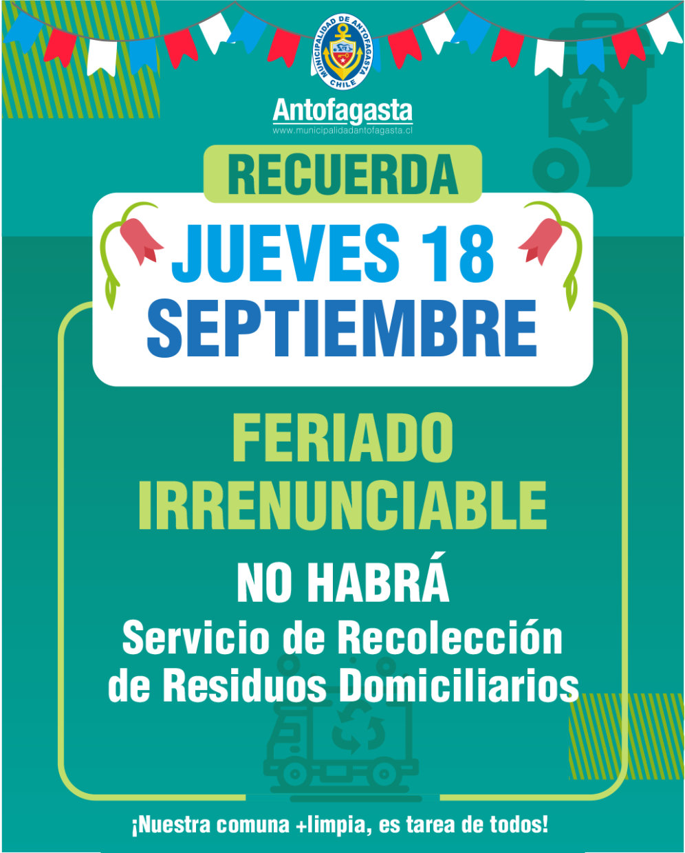 Desde el municipio se recomendó a la comunidad sacar la basura únicamente al momento de escuchar el paso del camión recolector, evitando depositarla en aceras o espacios públicos. La acumulación de desechos genera microbasurales y focos de insalubridad, especialmente en estas fechas de alta generación de residuos. Otros servicios municipalesEl funcionamiento de la Municipalidad de Antofagasta, será hasta este martes 17 a las 11:30 horas, retomando su atención al público el día lunes 22 de septiembre en horario de 08:30 a 13:30 horas. En el caso de la atención primaria de salud, los Cesfam Centro Sur, oriente, Corvallis y Rendic funcionarán el día 17 de septiembre en horario 12:00 a 00:00 horas y 18, 19, 20 y 21 de septiembre de 08:00 a 00:00 horas. Además, los SAPU Norte y Juan Pablo II funcionarán del día 17 en horario continuado hasta el día 22 de septiembre a las 08:00 horas. Asimismo, el SAR Coviefi funcionará desde el 17 al 21 de septiembre en horario continuo; mientras que la Farmacia Comunal cerrará sus puertas el día miércoles 17 a las 12:00 hrs, retomando su funcionamiento habitual el día lunes 22 de septiembre. | A su vez el Complejo Deportivo Escolar funcionará el miércoles 17 de septiembre hasta las 12:00 horas, el jueves 18 y viernes 19 permanecerá cerrado, retomando su normalidad los días sábado 20 y domingo 21 de septiembre.