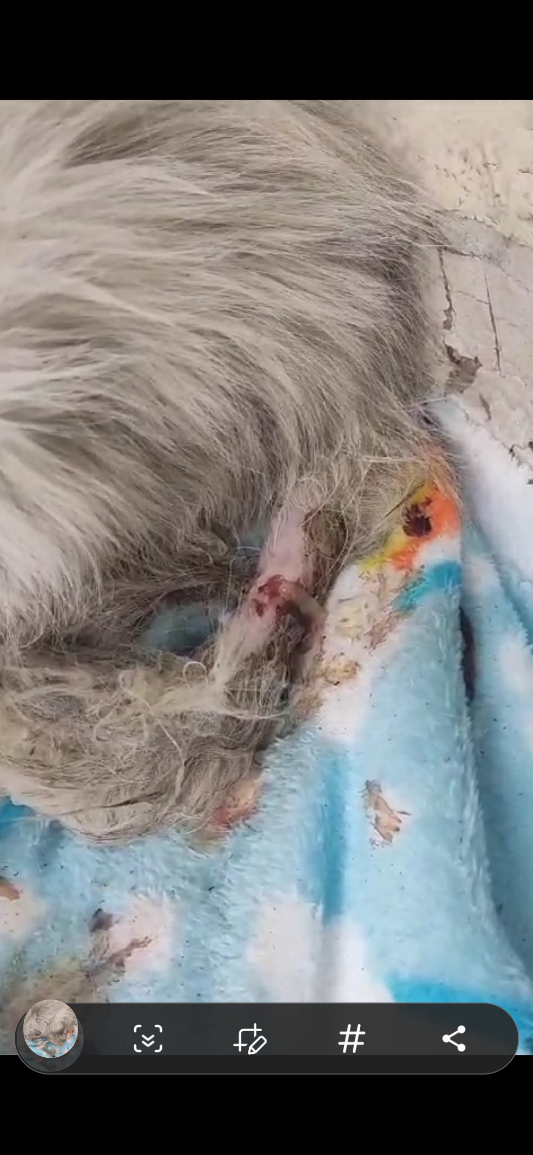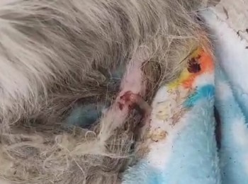 Gatita callejera en muy mal estado dio a luz en mi patio, los gatitos fallecieron luego de brindarles la ayuda posible y ella se marchó, pero despues de unos dias volvió muy mal herida, se puede observar un agujero en su cola donde bota materia y una les