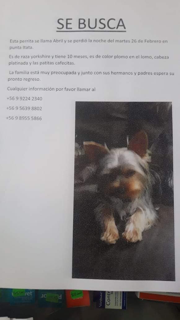 Perrita perdida. Responde al nombre de Abril. Se perdio el dia martes 26 de febrero en punta itata. Tiene carita platinada y lomo plomito; patitas platinadas. Cualquier informacion sera gratamente recibida.