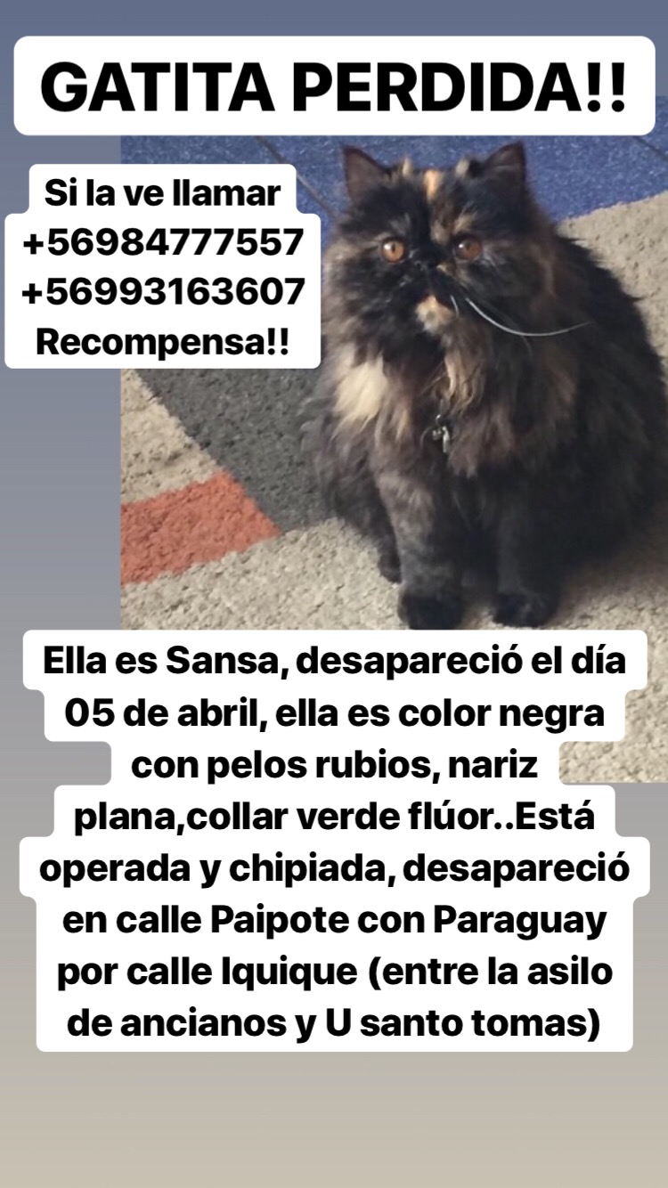 Sansa es una gata persa carey, la sacaron de mi casa hace 1 año, tiene la denuncia en la pdi y en fiscalía Vive entre la santo tomas de calle Iquique y la acilo de ancianos (calle Federico schwager)