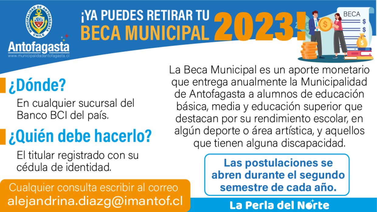 La Beca Municipal es un beneficio que la Municipalidad de Antofagasta entrega todos los años a estudiantes de diferentes establecimientos educacionales, ya sea municipal, subvencionado o particular.