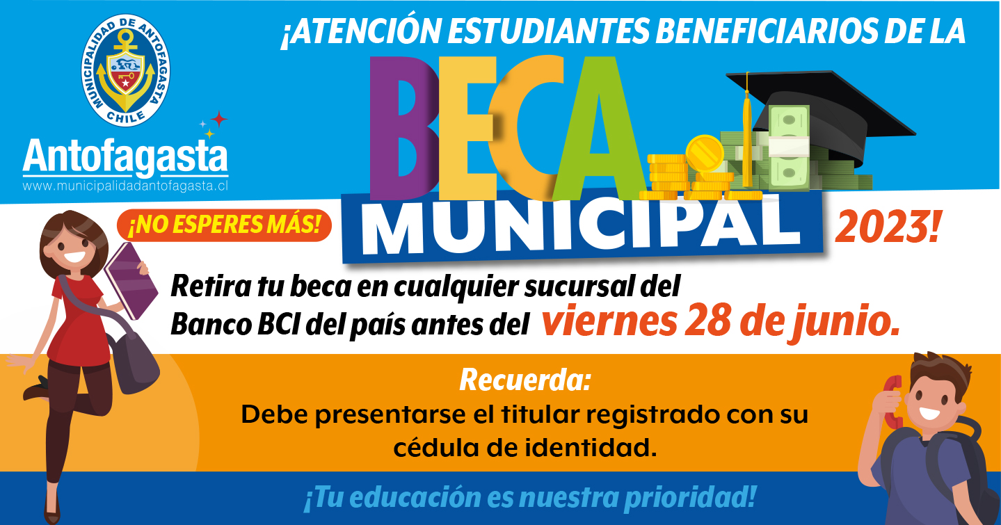 La Municipalidad de Antofagasta reitera el llamado a todos los beneficiarios de la Beca Municipal 2023 para alumnos de educación básica, media y educación superior a retirar sus fondos depositados en cualquier sucursal del Banco BCI a lo largo del país.