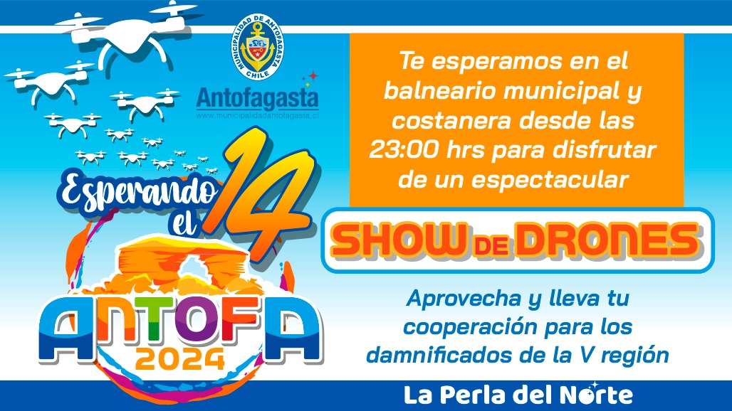 La Municipalidad de Antofagasta a través del alcalde, Jonathan Velásquez Ramírez, invita a toda la comunidad a celebrar el aniversario 145 de la ciudad con un gran show de drones cargado de sorpresas referentes a los principales símbolos de la ciudad en el sector del Balneario Municipal.